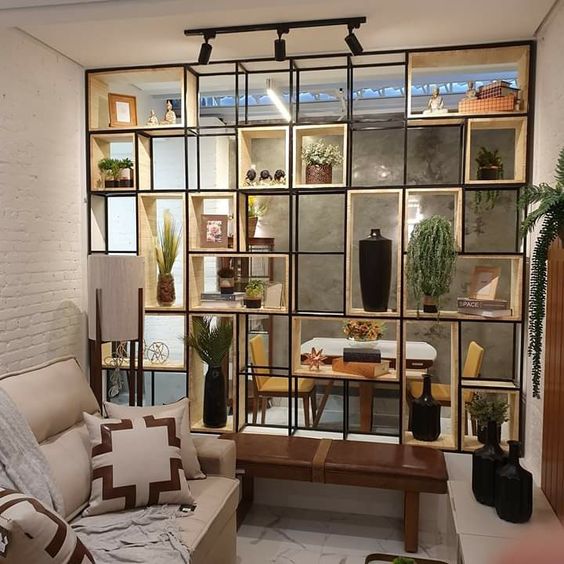 Anda juga dapat mencoba untuk membedakan ruangan dengan menggunakan rak terbuka. Partisi ruang tamu ini akan sangat cocok untuk Anda para pecinta gaya rumah minimalis modern. Pemakaian lemari maupun rak khusus untuk pajangan yang terbuat dari kayu dapat memancarkan kesan yang hangat untuk ruangan.