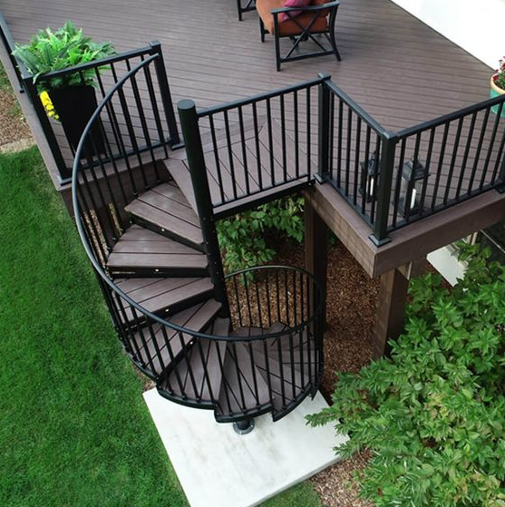 Model tangga besi minimalis dengan bentuk melingkar ini sangat cocok digunakan diluar ruangan, umumnya digunakan untuk akses menuju ruangan terbuka seperti teras atas atau loteng.
