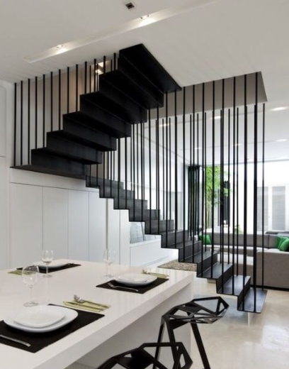 Tangga besi dengan model menggantung dengan tali besi ini menjadi model tangga yang bisa memberikan ruang di bawahnya. Kamu bisa memanfaatkan banyak ruang dibawah tangga untuk penyimpanan juga. Salah satu tips bagi kamu yang punya rumah minimalis untuk memanfaatkan ruangan.