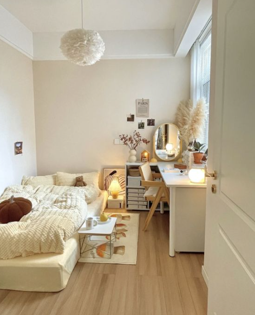 Kamar tidur ala korea terlihat cantik, simpel dan Insta-worthy salah satunya dikarenakan tampilannya yang terkesan cozy. Gunakan furnitur dan barang-barang yang mengandung banyak unsur kayu di dalamnya. Misalnya dengan menggunakan tempat tidur, lemari, atau rak yang terbuat dari kayu atau memiliki tampilan seperti kayu.