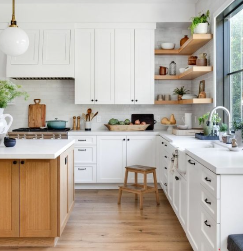 Layout L memungkinkan optimalisasi ruang sudut untuk penyimpanan atau area kerja. Gunakan lemari sudut yang inovatif untuk memaksimalkan ruang penyimpanan. Pilih kabinet dengan detail klasik, seperti pintu kabinet bergaya panel dengan gagang bertema vintage atau klasik. Rak terbuka atau kaca pada beberapa bagian kabinet dapat menambah kesan hangat dan menyajikan ruang untuk menampilkan piring atau pernak-pernik klasik.