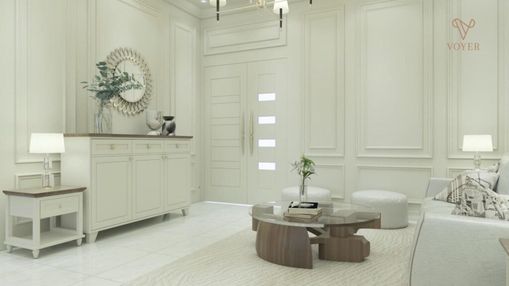 Perabotan atau furniture pada rumah dengan desain interior yang klasik biasanya berbahan kayu solid ataupun marmer. Meja makan, kursi makan, lemari hingga sofa umumnya terbuat dari kayu dengan ukiran yang indah dan tidak jarang berharga mahal. Sedangkan untuk aksesoris, wallpaper dengan motif serta vas bunga yang besar, lampu gantung Kristal adalah pilihan yang cocok untuk gaya klasik.
