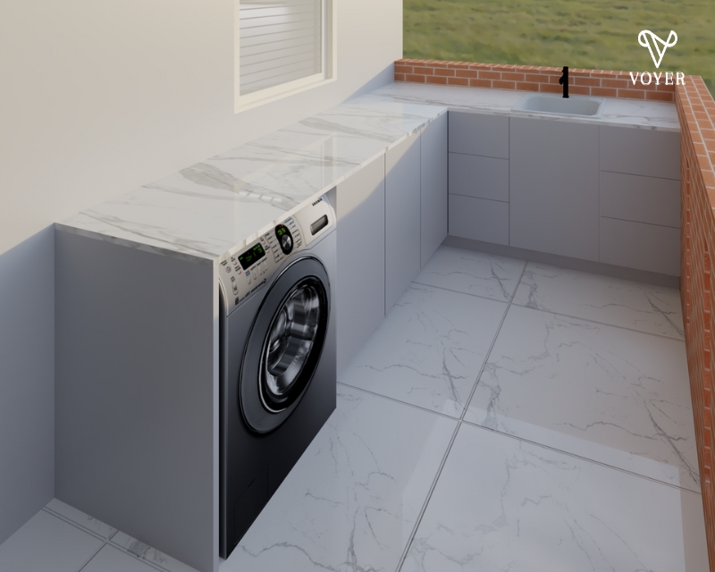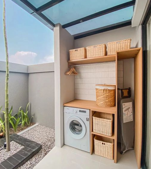 Untuk mengaplikasikan desain ini, Anda hanya perlu melengkapi dengan atap kanopi untuk lindungi mesin cuci dari hujan.