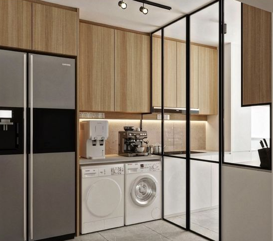 Sedangkan, untuk jaga keamanan mesin cuci dari pencurian, Anda bisa buat ruangan khusus untuk aplikasikan pintu geser.