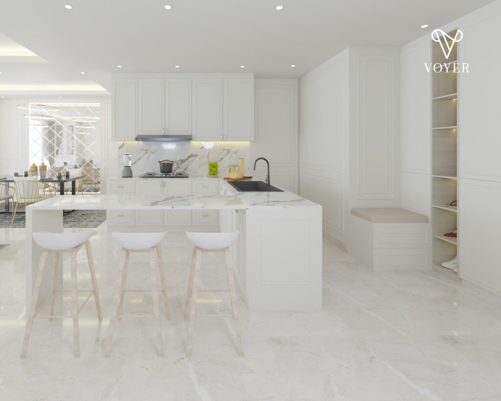 Sedangkan, penempatan kulkas menyatu dengan kabinet pada satu sisi dan warna putih di meja bar dengan bentuk modular akan berikan kesan yang minimalis serta cantik di area dapur.