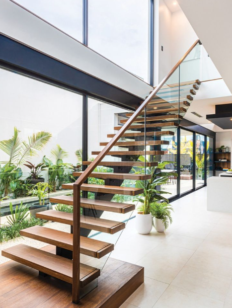 Tangga dengan konsep semacam ini sangat cocok diterapkan pada hunian high-tech. Konsep futuristiknya makin terlihat bila Anda menambahkan lampu di bawah lantai yang menyorot ke arah anak tangga. Kendati demikian, diperlukan perhitungan yang cermat untuk membangun tangga ini.