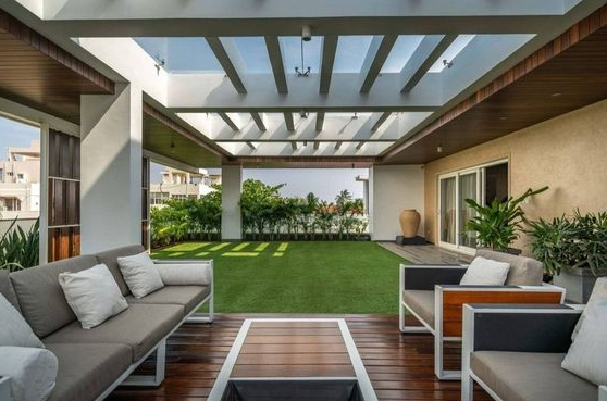 Teras panjang terbuka bisa menjadi salah satu pilihan yang menarik. Anda bisa menanam rumput dan tanaman-tanaman kecil lainnya untuk membuat taman kecil sederhana yang bisa memanjakan mata setiap hari. Jika Anda memiliki anak kecil di rumah, Anda juga bisa memberikan mainan seperti seluncuran mini untuk si kecil.