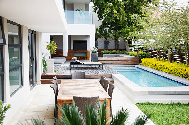 Jika lahan yang ada memungkinkan, Anda bisa juga membuat kolam renang di depan teras panjang Anda. Namun jika lahan yang ada terlalu sempit untuk kolam renang, Anda bisa memilih kolam ikan yang tidak butuh ruang yang banyak. Anda bisa santai di pagi atau sore hari, menikmati hari sambil memandangi kolam, plus dengan teh atau kopi hangat di meja teras.