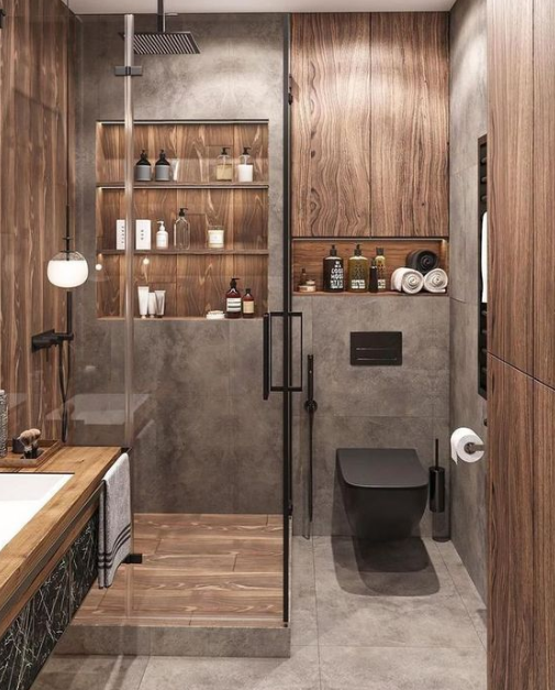 Tambahkan perabot kamar mandi berwarna coklat atau putih untuk keseimbangan yang harmonis.