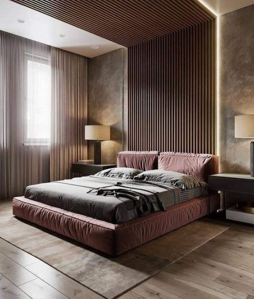 Untuk bagian langit-langit yang unik, kamu dapat menggunakan panel kayu di bagian atasnya. Hal ini sangat membantu untuk desain kamar tidur yang sempit agar terasa lebih lapang. Tidak hanya itu, jika kamu ingin mendapatkan kenyamanan saat beristirahat, kamu juga dapat menggunakan desain atap joglo yang dilengkapi lapisan panel kayu.