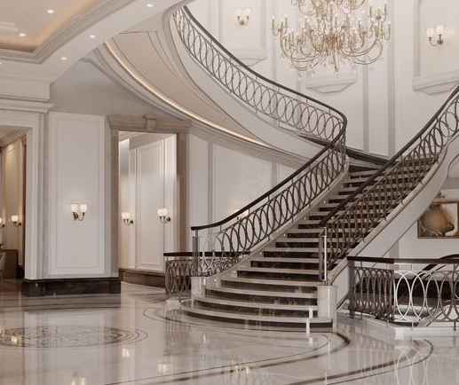 Kalau Anda ingin mempunyai interior rumah dengan konsep seperti istana kerajaan, maka bisa mempertimbangkan bordes tangga yang berperan sebagai balkon juga. Melalui balkon itulah, maka pemilik rumah juga bisa sekaligus melihat area ruang tamu yang terdapat di bawahnya.